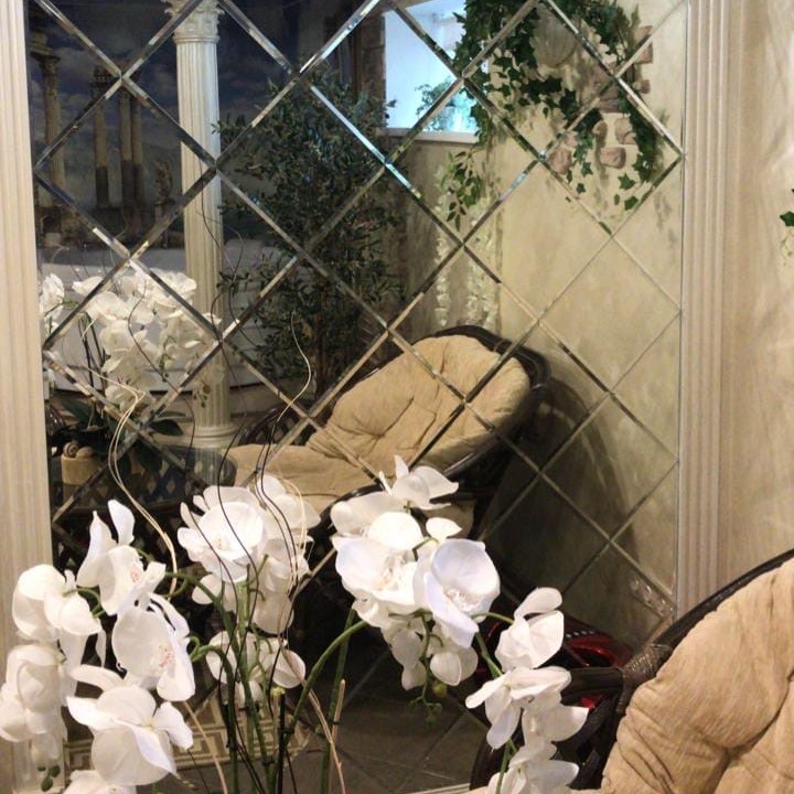 Использована квадратная серебристая зеркальная плитка размером 18х18.